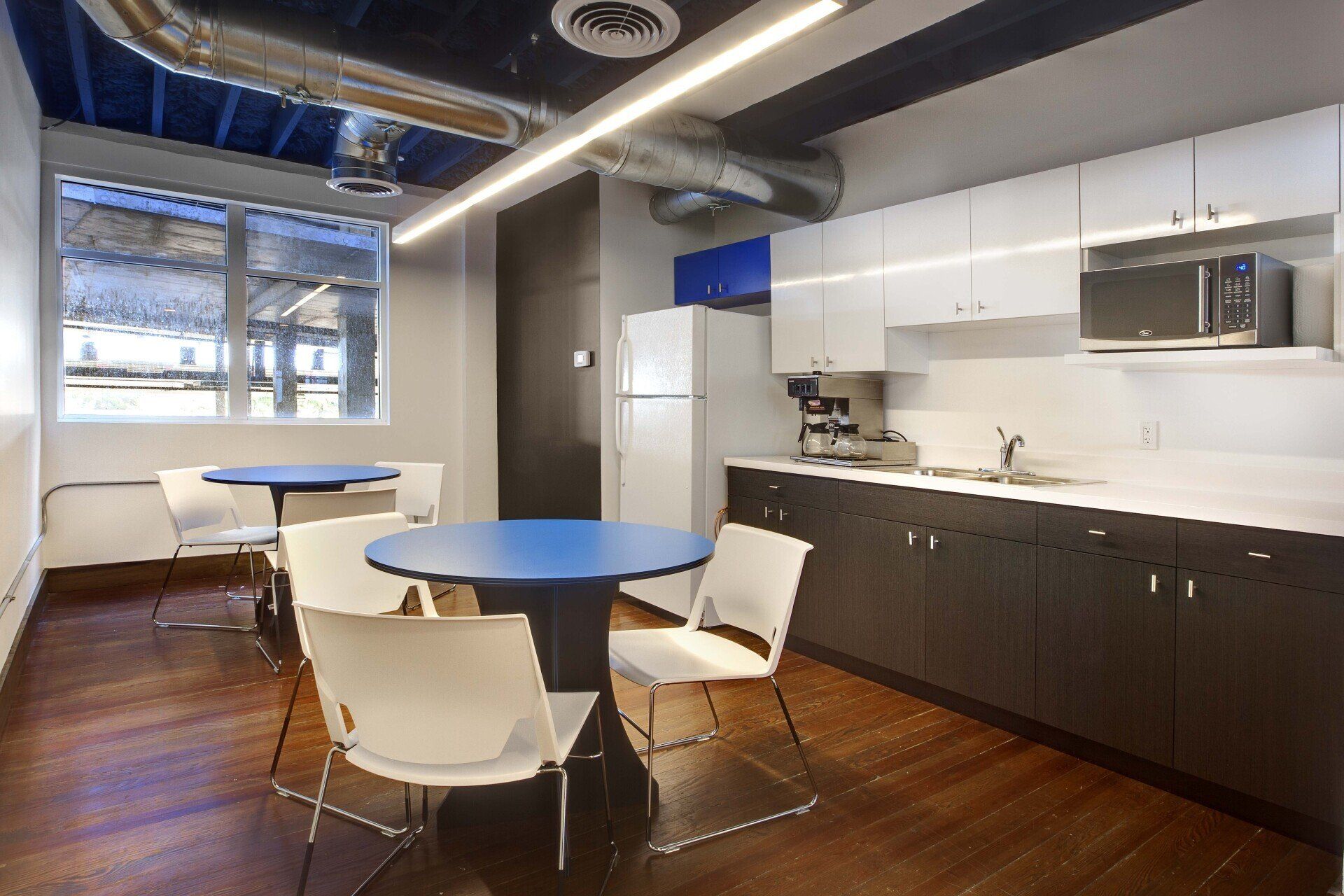 Perimeter offices were separated from the main area by floor-to-ceiling butt glazing, and the kitchen areas on both floors were finished with whiteboard cabinetry and furnished with tables from the Linear line designed by Schimberg Group and manufactured by Specrite.