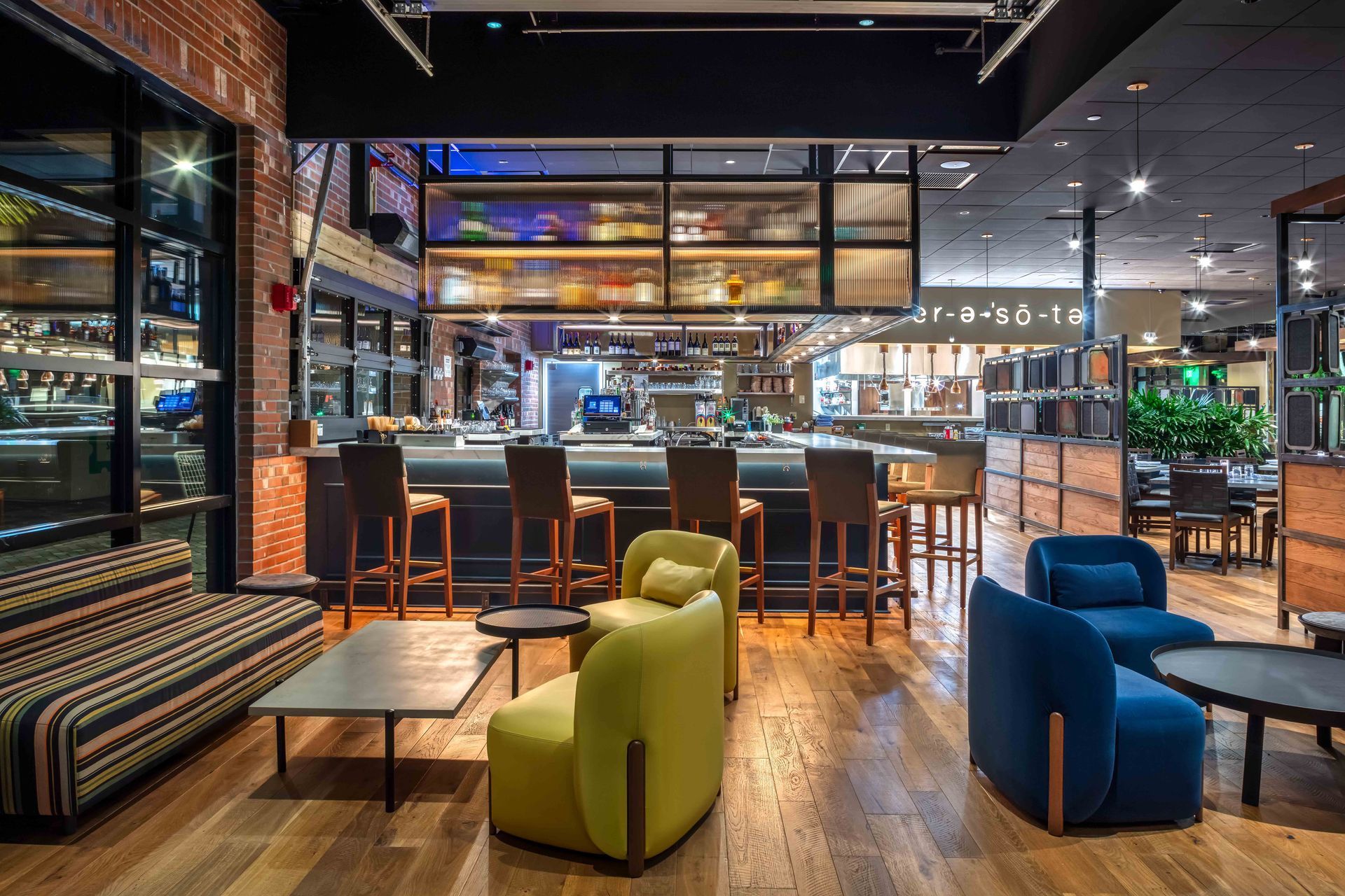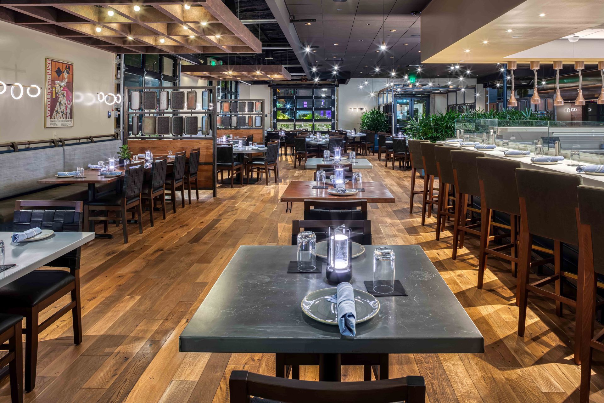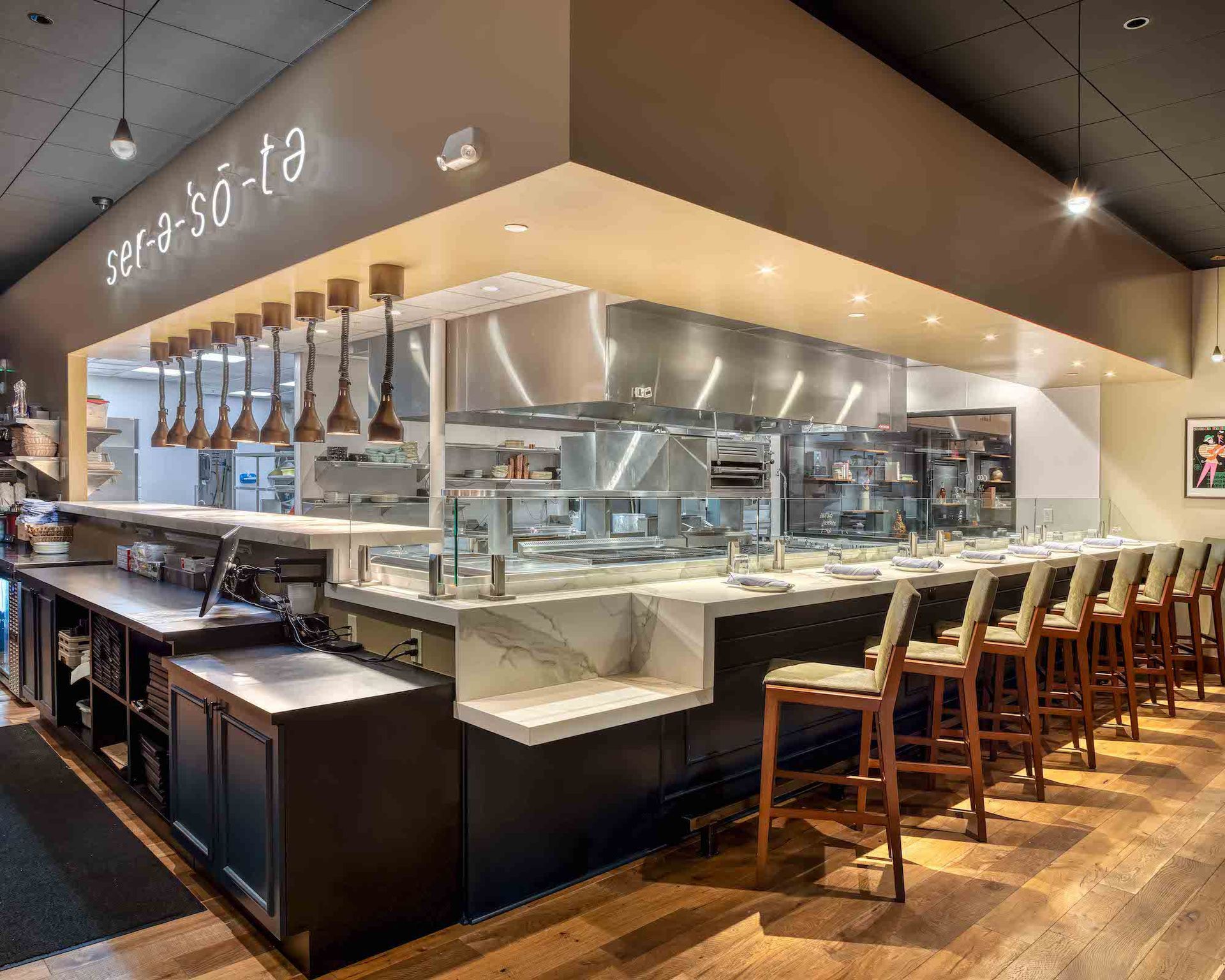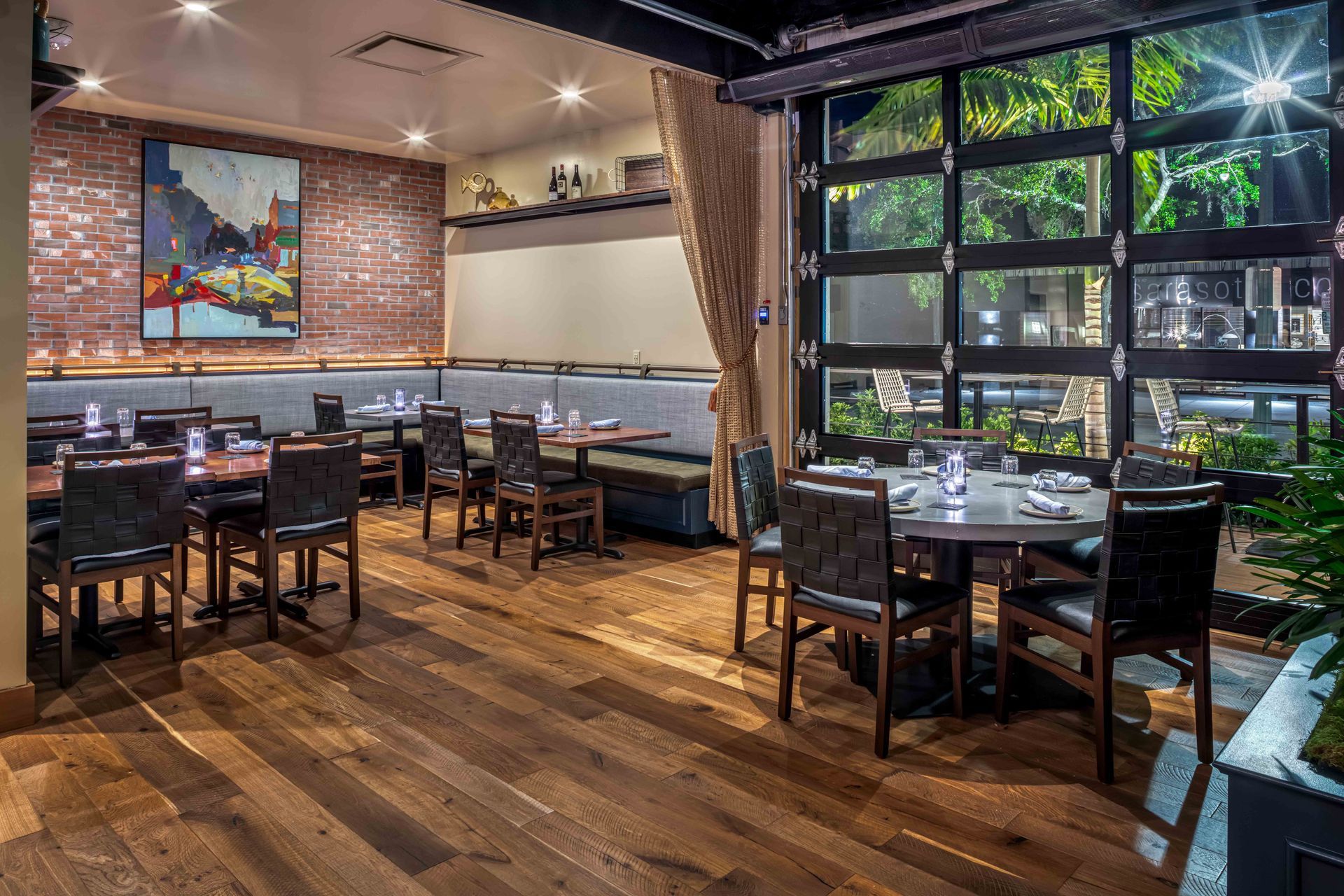 The restaurant provides multiple seating experiences, ranging from a private party niche to a tasting room to an eating bar to booths to a lounge area with full service bar amenities.