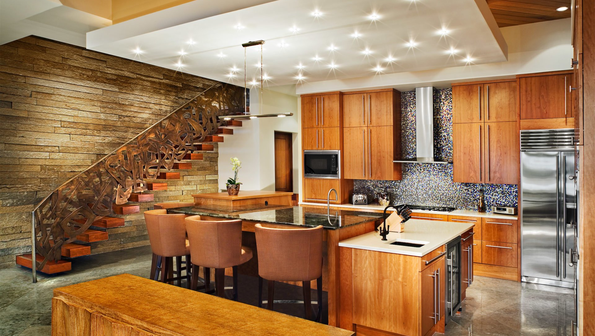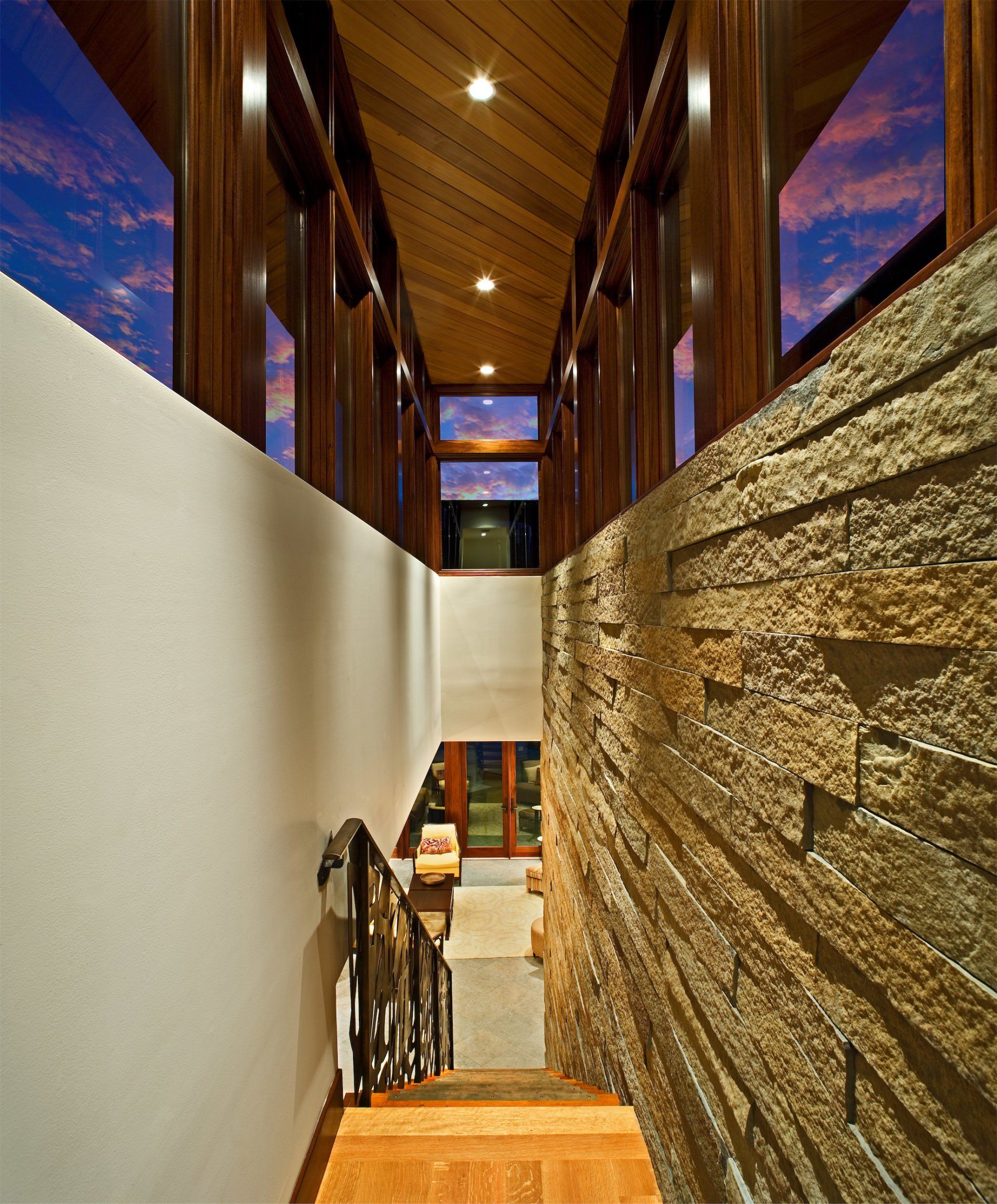 Unique elements of basalt stone are used throughout and highlighted at the custom staircase. To unify the beauty of the basalt wall (cut into horizontal strips) and the organic bronze sculptured railing set on floating wood treads, the relationship of these two elements were deliberately kept close to one another, creating a piece of art centrally located within the space.