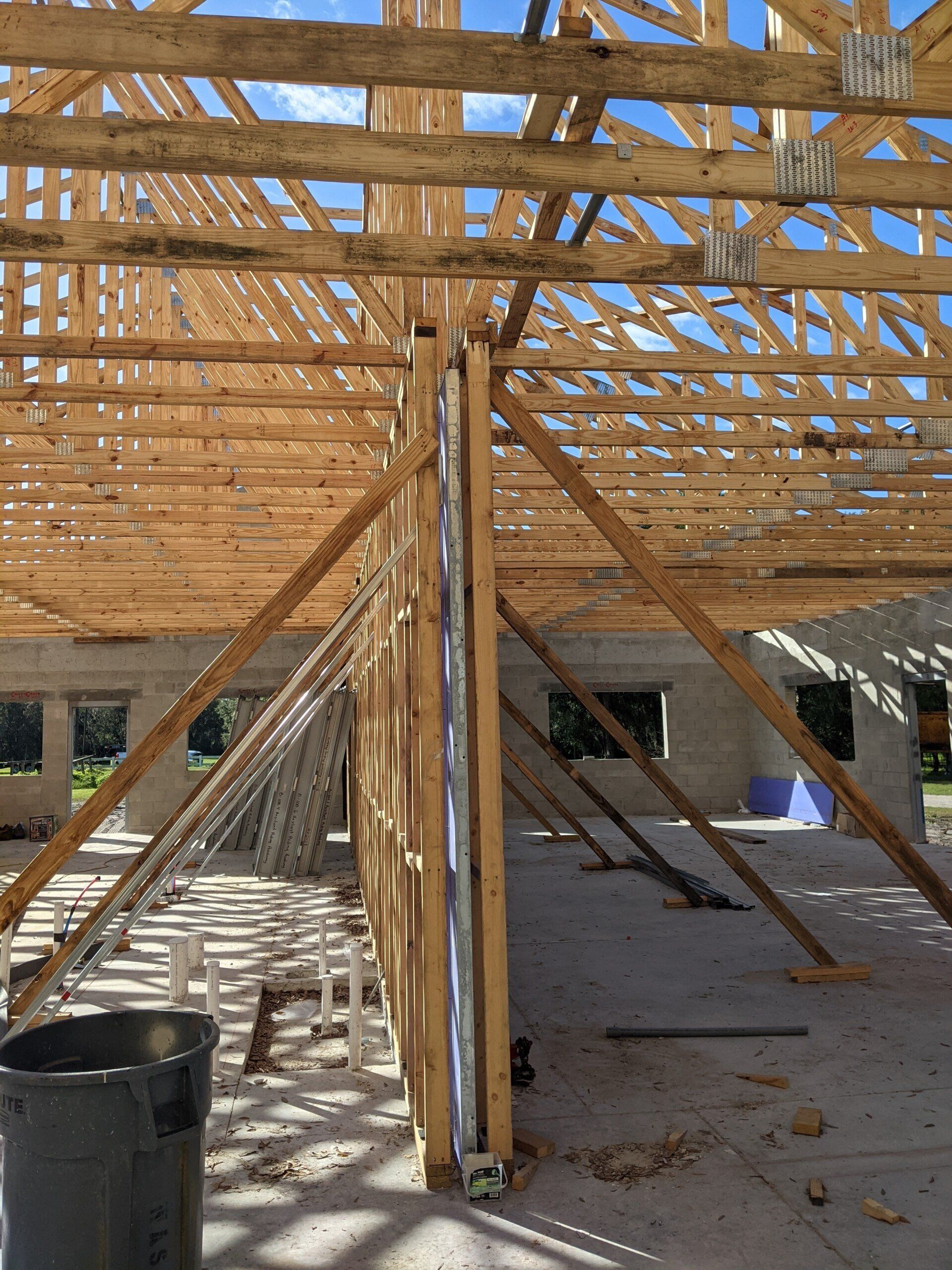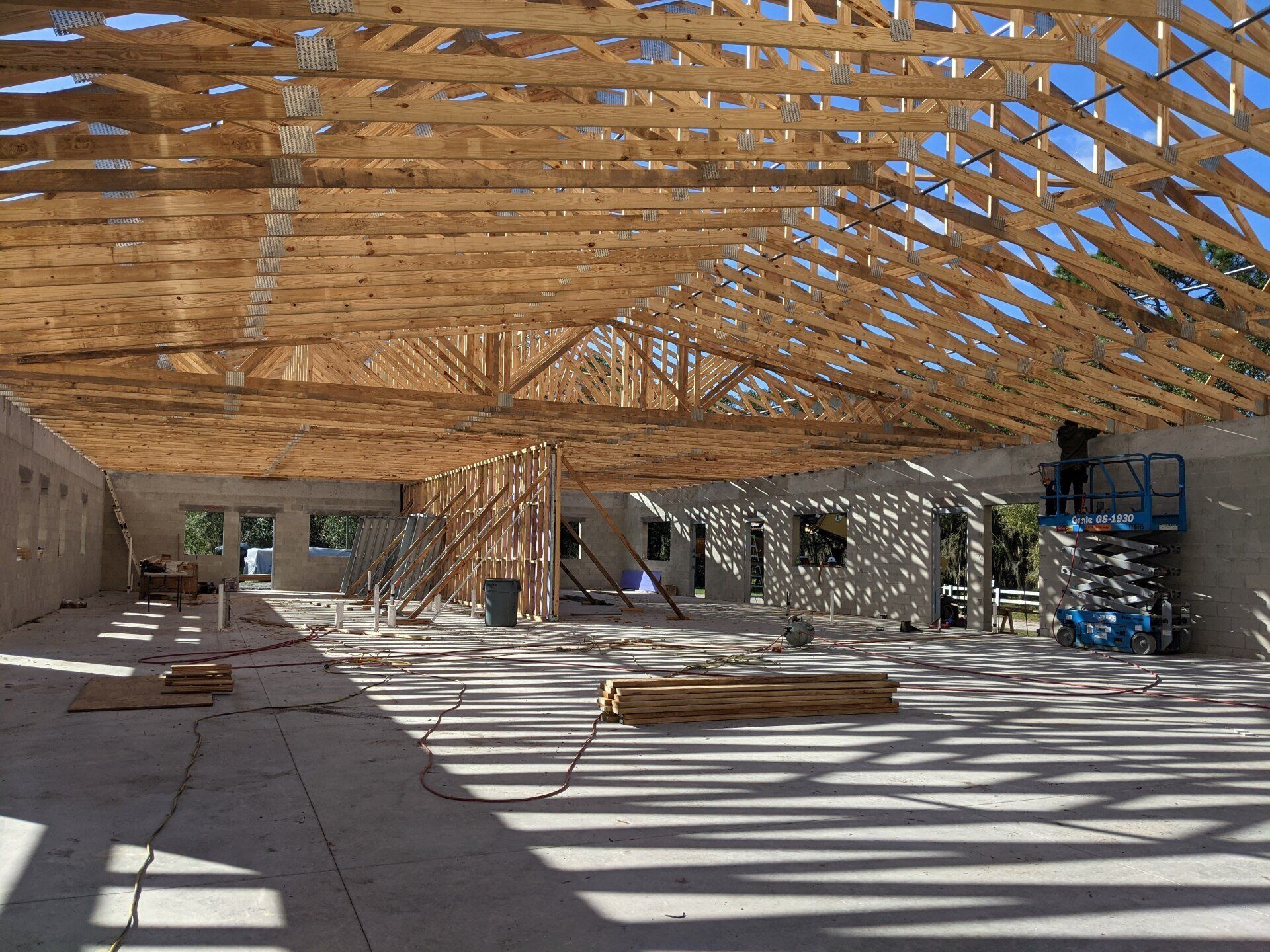 There is something beautiful about the moment that trusses are installed on buildings. The Community Center Barn building at Resilient Retreat has recently received the trusses and the shadows and patterns and plays of light and wood are always mesmerizing.