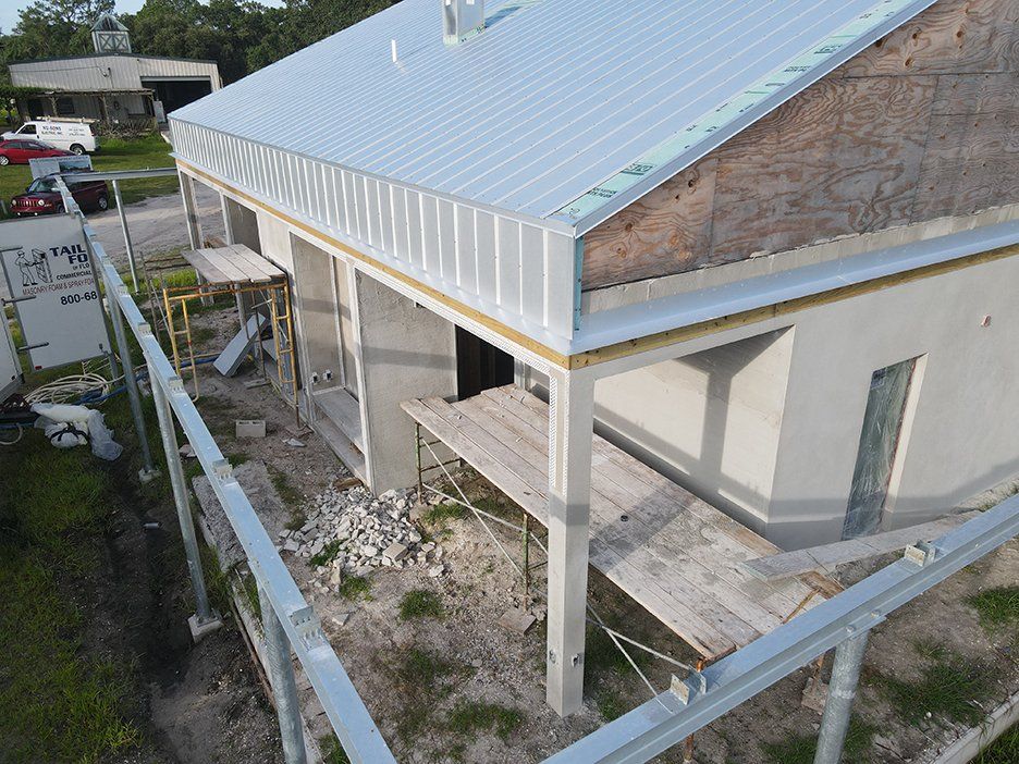 This post is focused on the roof. As you can see, the metal galvalume roof is being installed. The flashing details create interesting shapes and the key to this roof is the edge detail as it turns down the wall, creating a fluid transition between roof, wall and ultimately, the canopy below.