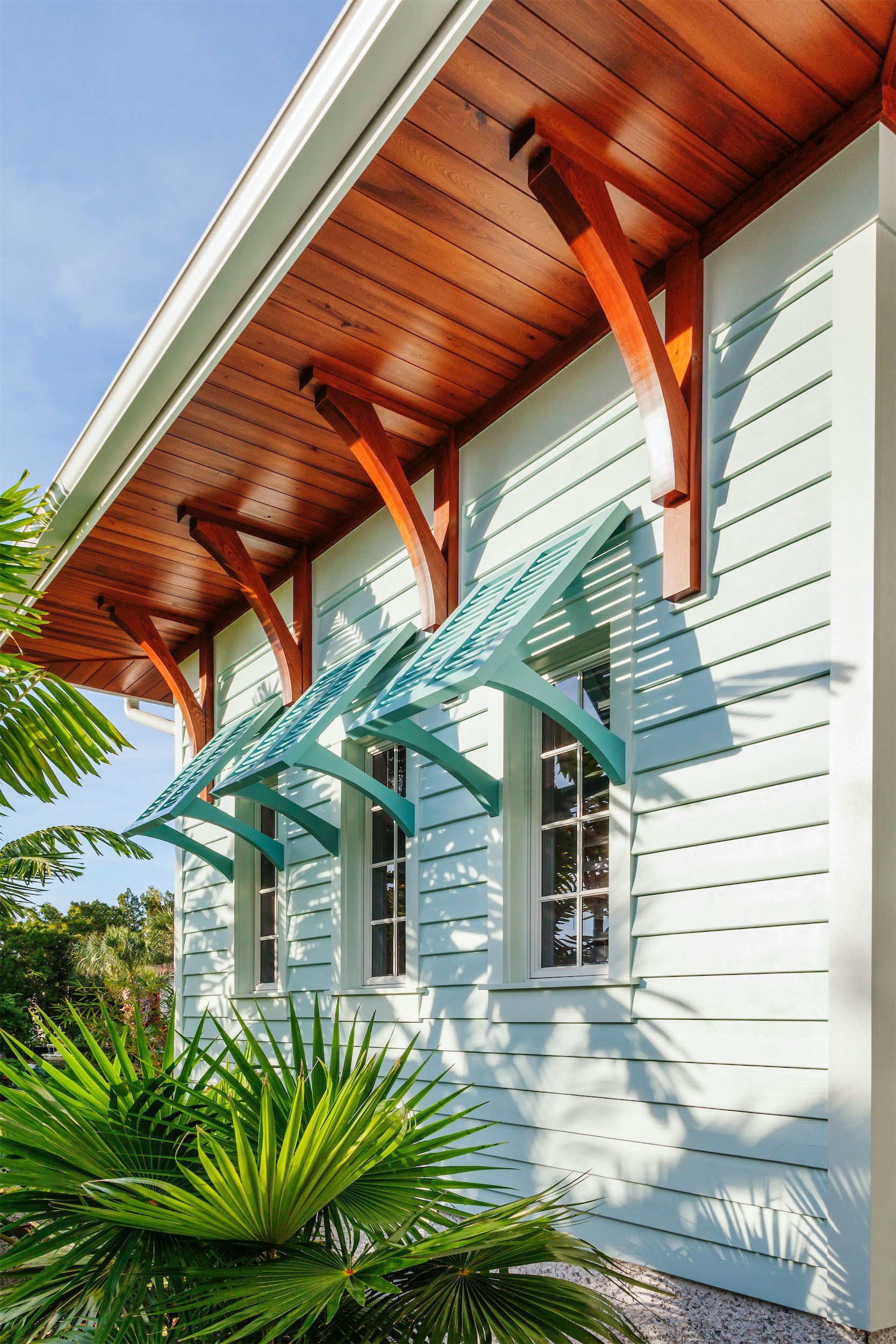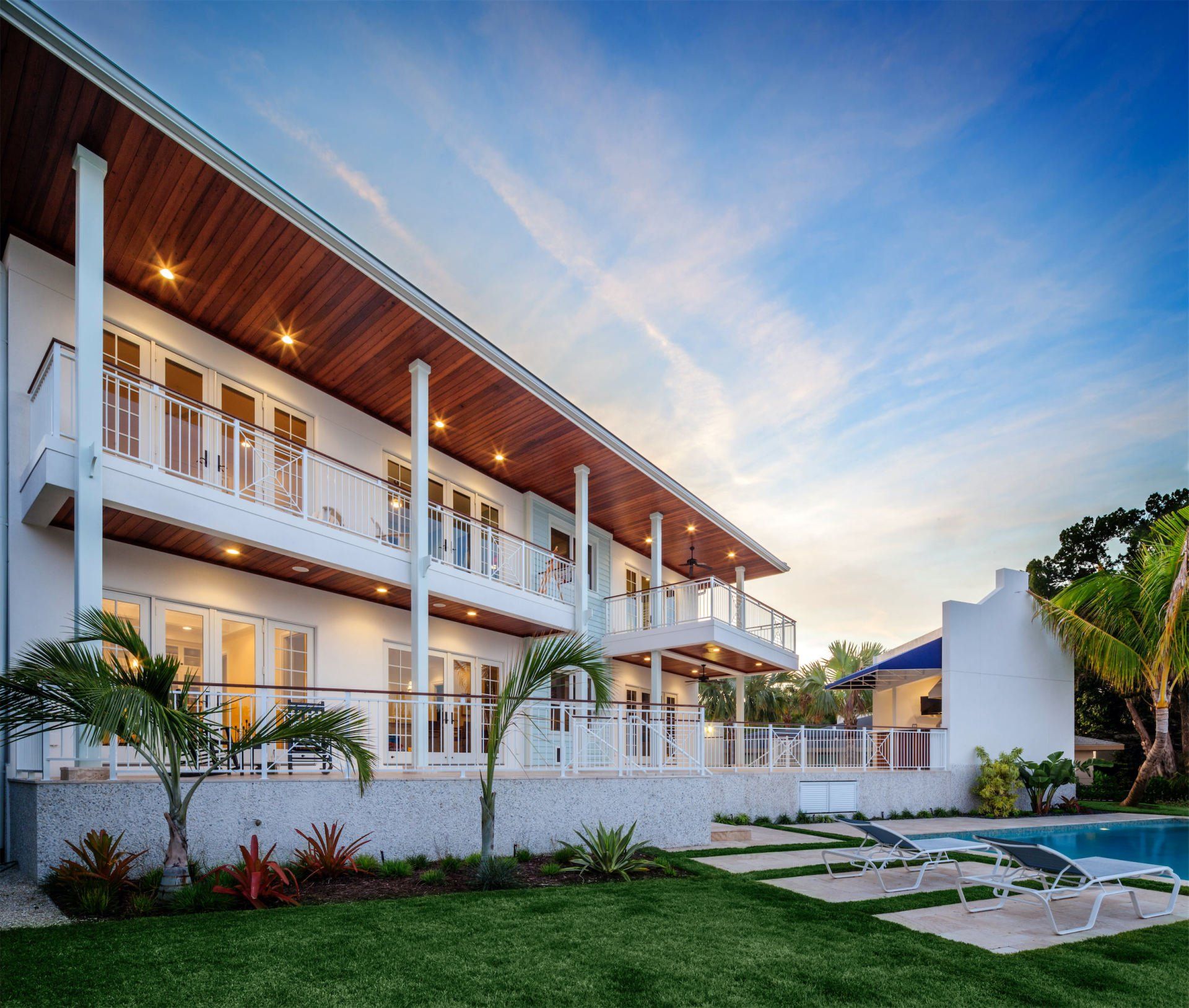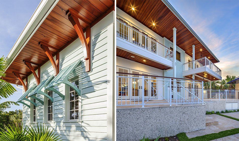 Schimberg Group blended island design components like deep balconies, horizontal siding, rich wood soffits, decorative wood brackets and Bahama shutters with modern elements including oversized roof overhangs, angular lines and architectural columns reaching from ground to roof. Views of Sarasota Bay and an iconic bridge are showcased throughout the indoor/ outdoor living spaces.