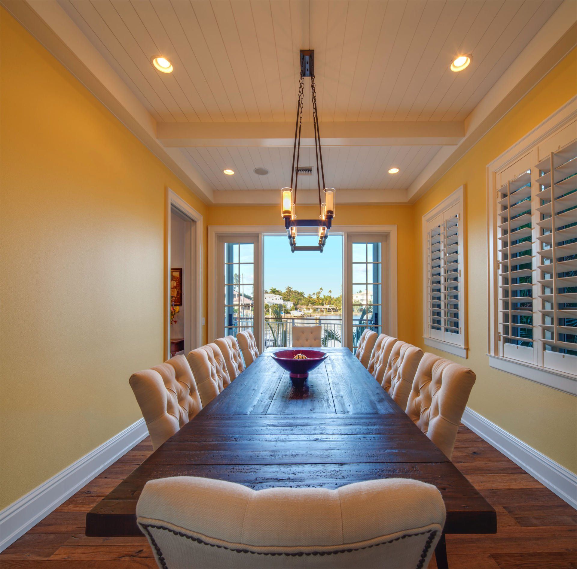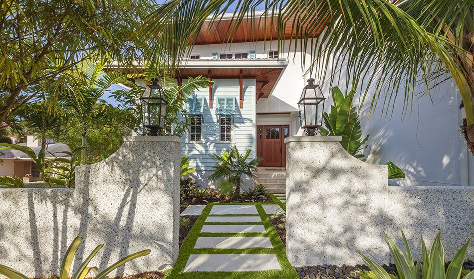 An entry drive, topped with concrete mixed with shells, was deliberately offset to allow for a beautifully landscaped front yard, rare on Siesta Key. Three-foot high tabby stone forms a base around the entire home, which is painted stark white with accents of pastel blues and greens reflecting the rectangular aqua pool.