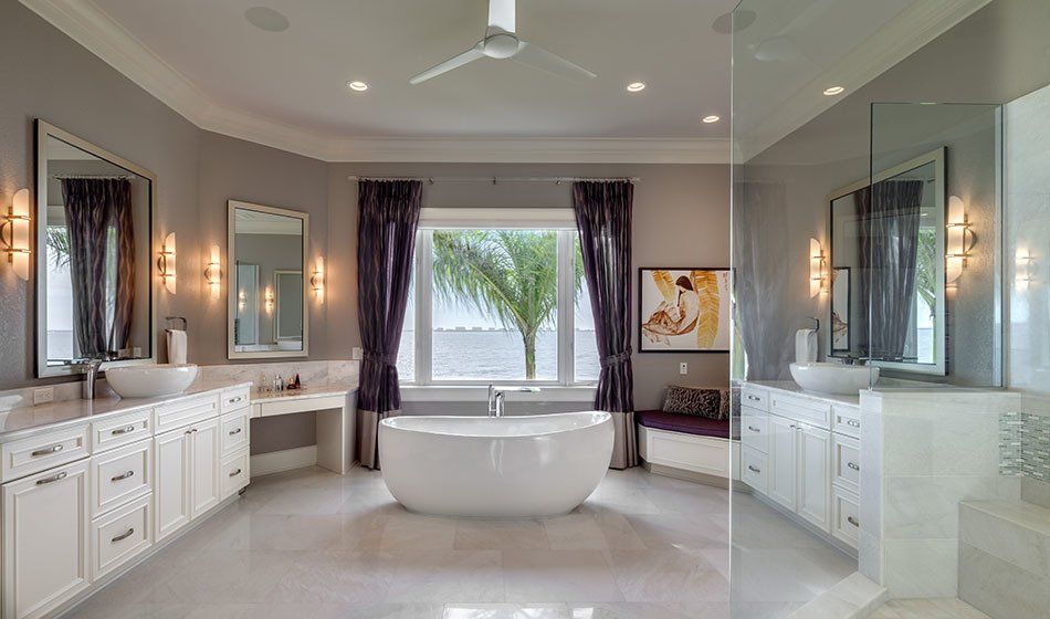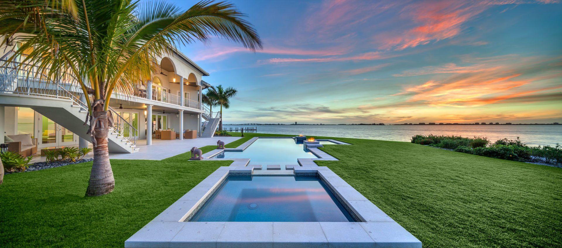 By replacing much of the disproportionate shapes with new windows, changing the roof to a gray slate and painting the building, the exterior took on a stately presence on a traditional cul-de-sac. A rectangular modern pool now features a sun shelf and the connected spa is surrounded by zoysia grass and seems to float in the yard and flow to the Bay beyond.
